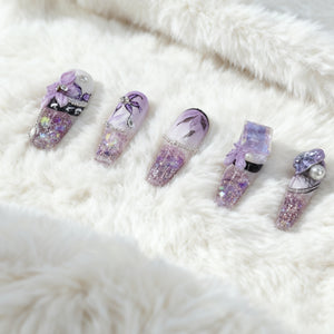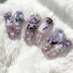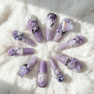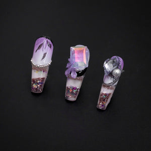 At a garden party after the rain, our designer noticed dewdrops resting on velvety purple petals, each one catching the light like a tiny chandelier. In that moment, she was inspired to bring the romance of “flowers and light” to your fingertips—crafting delicate 3D blossoms and shimmering gems over a crystal-clear base, as if fresh morning dew were glowing right on your nails.