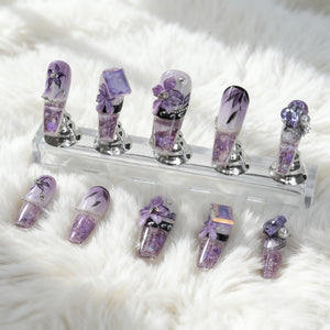 "Dewdrop Blooms" Luxury 3D Flower Gem Purple Press-On Nails - Coffin Nails