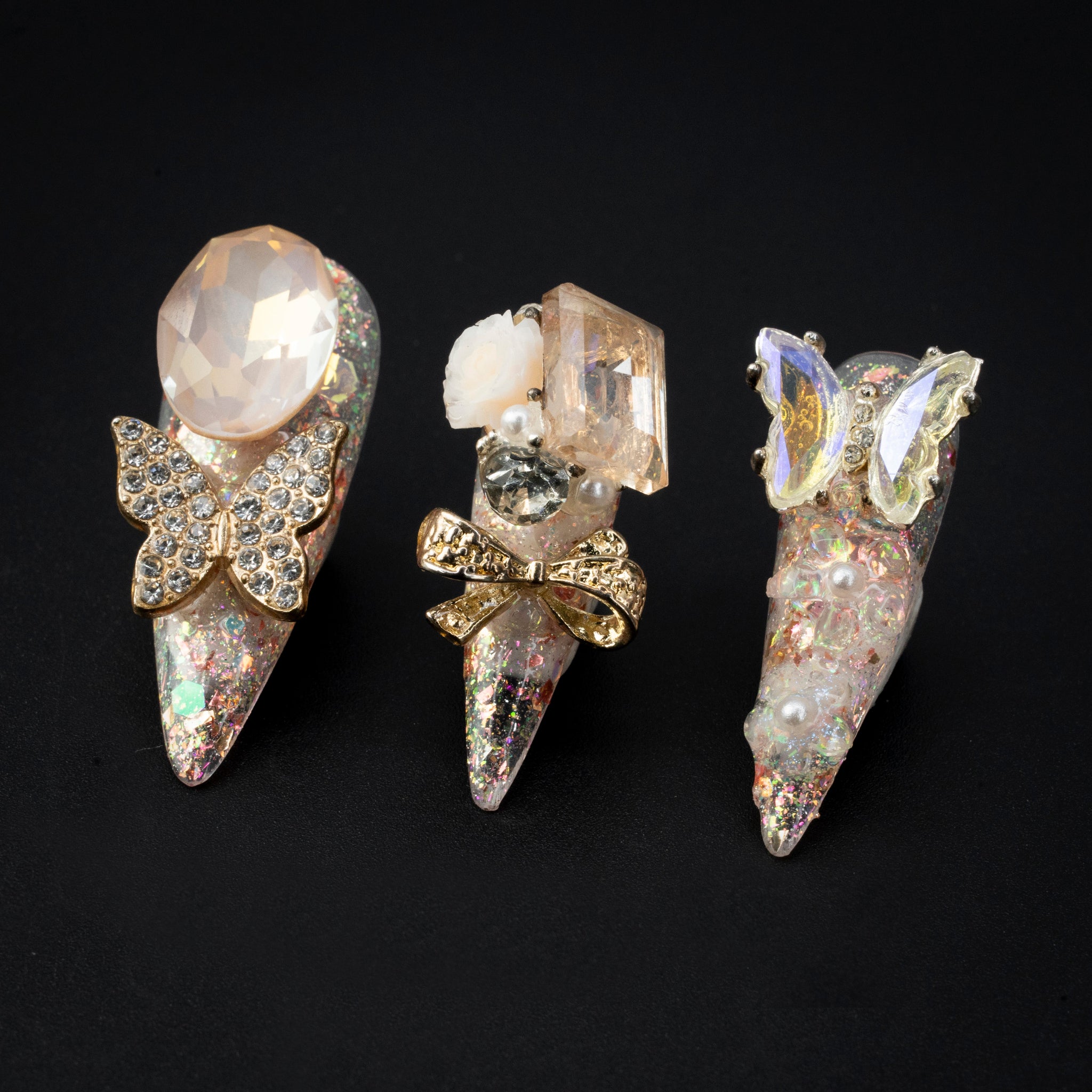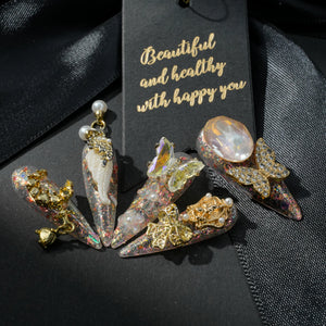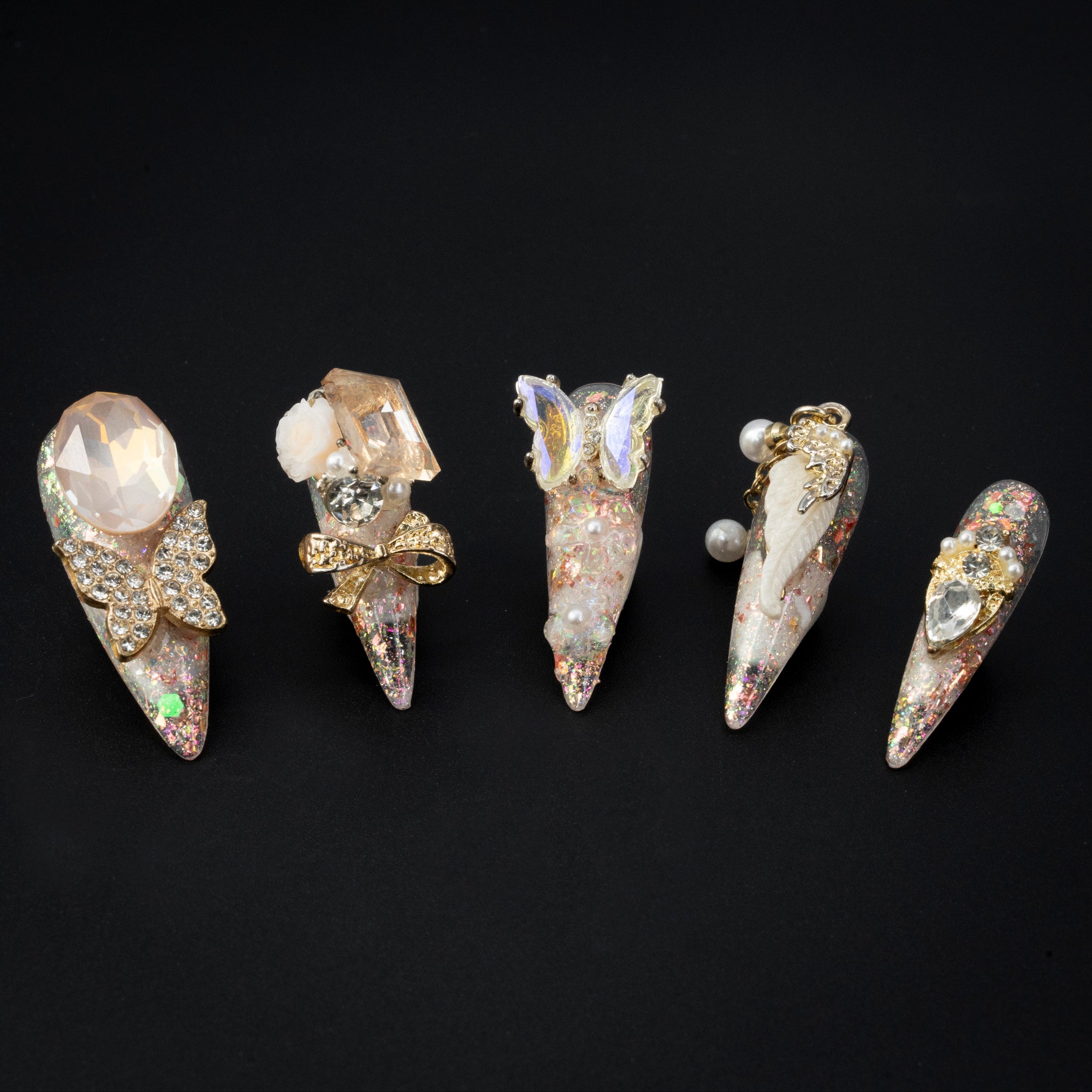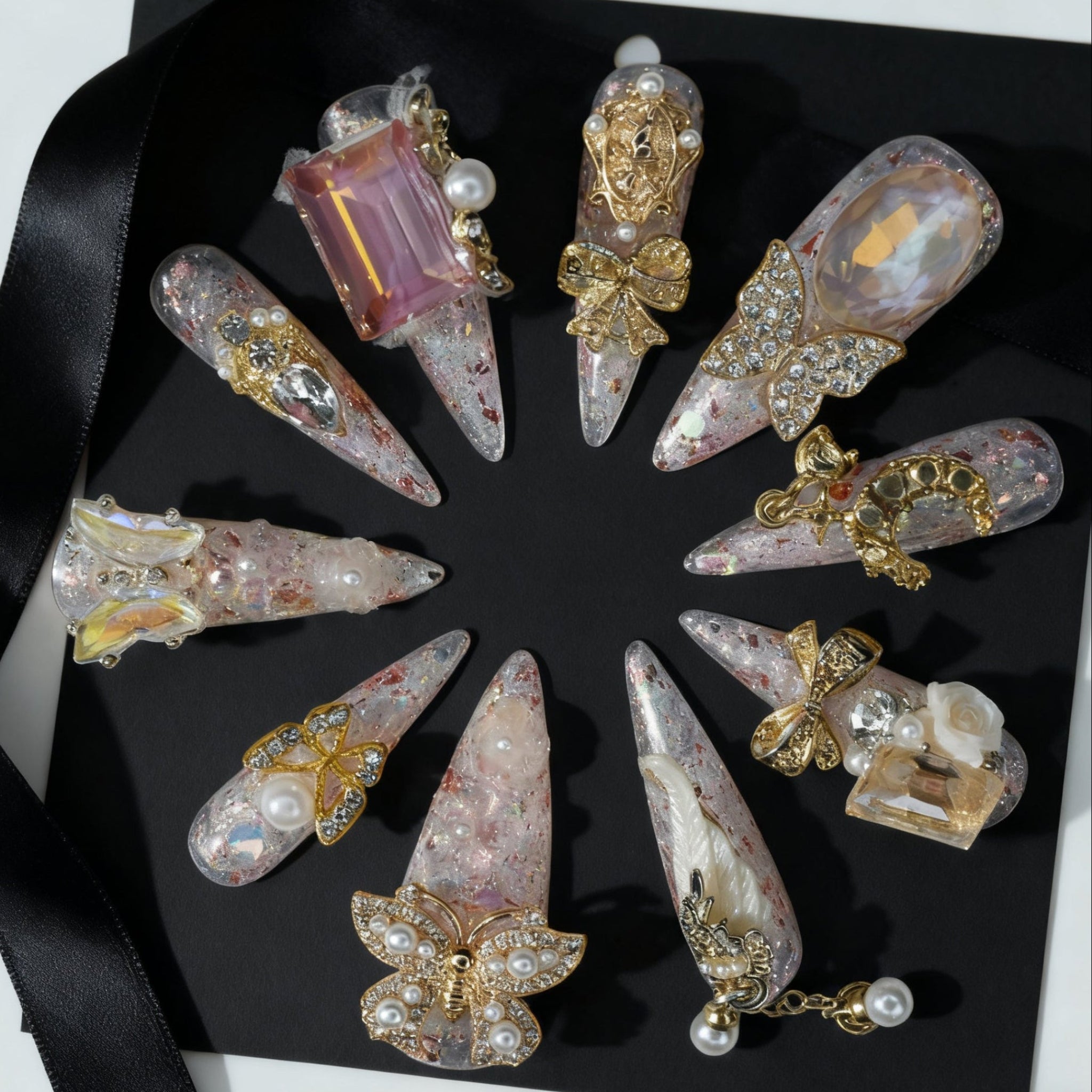 · Lavish Embellishments: Each nail is adorned with generously sized crystals, luminous pearls, and delicate metal butterflies, offering a richness of detail that elevates it far beyond ordinary press-ons.