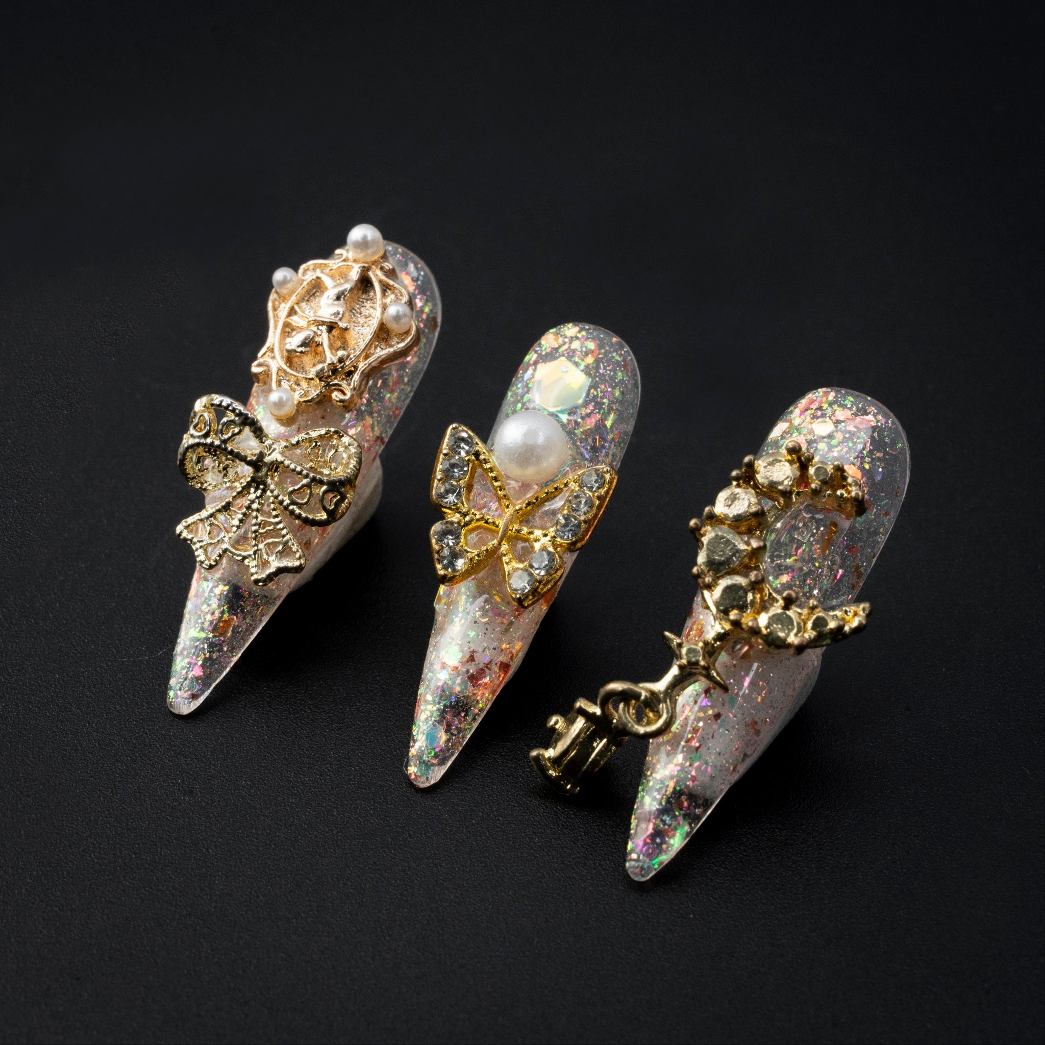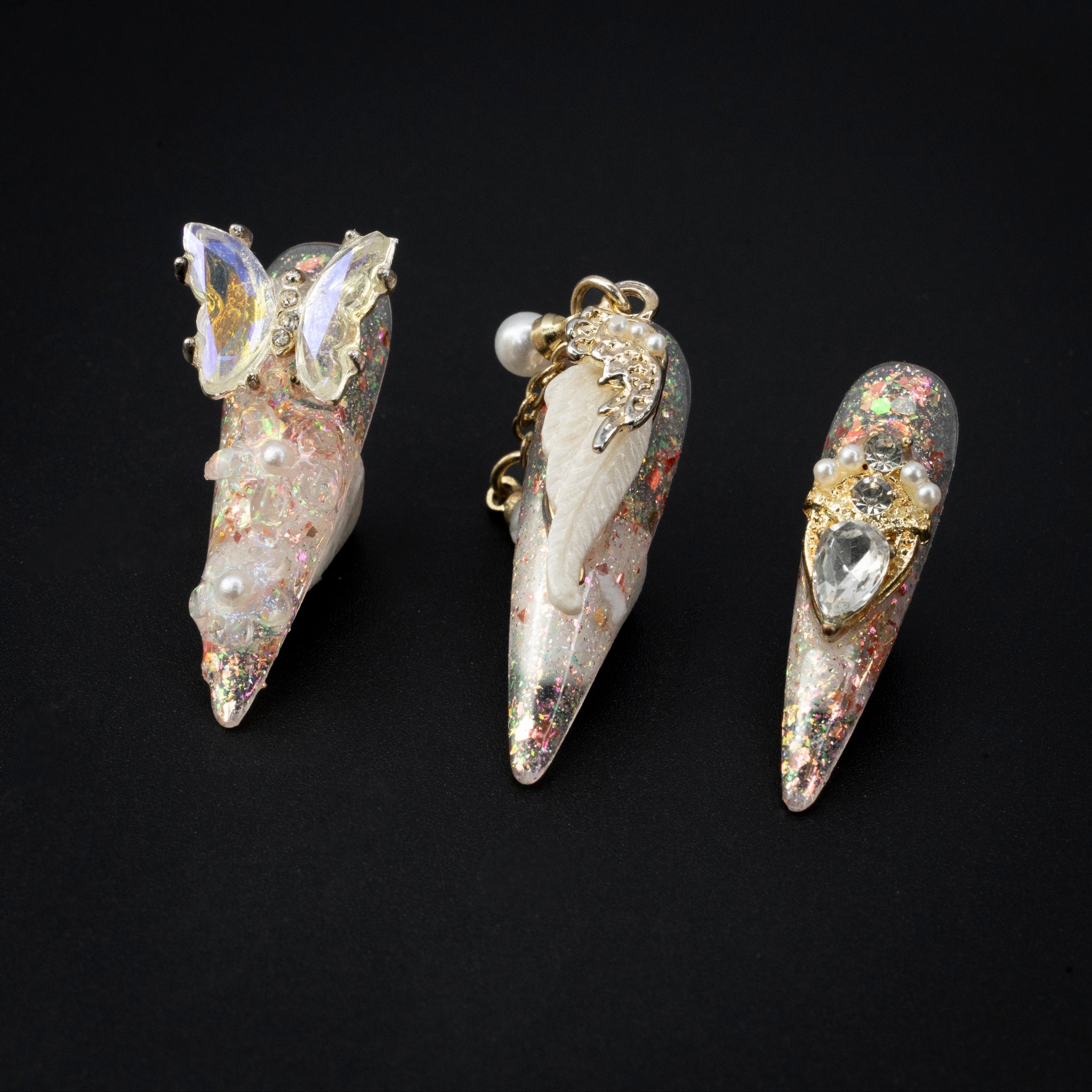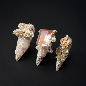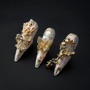 · Lavish Embellishments: Each nail is adorned with generously sized crystals, luminous pearls, and delicate metal butterflies, offering a richness of detail that elevates it far beyond ordinary press-ons.