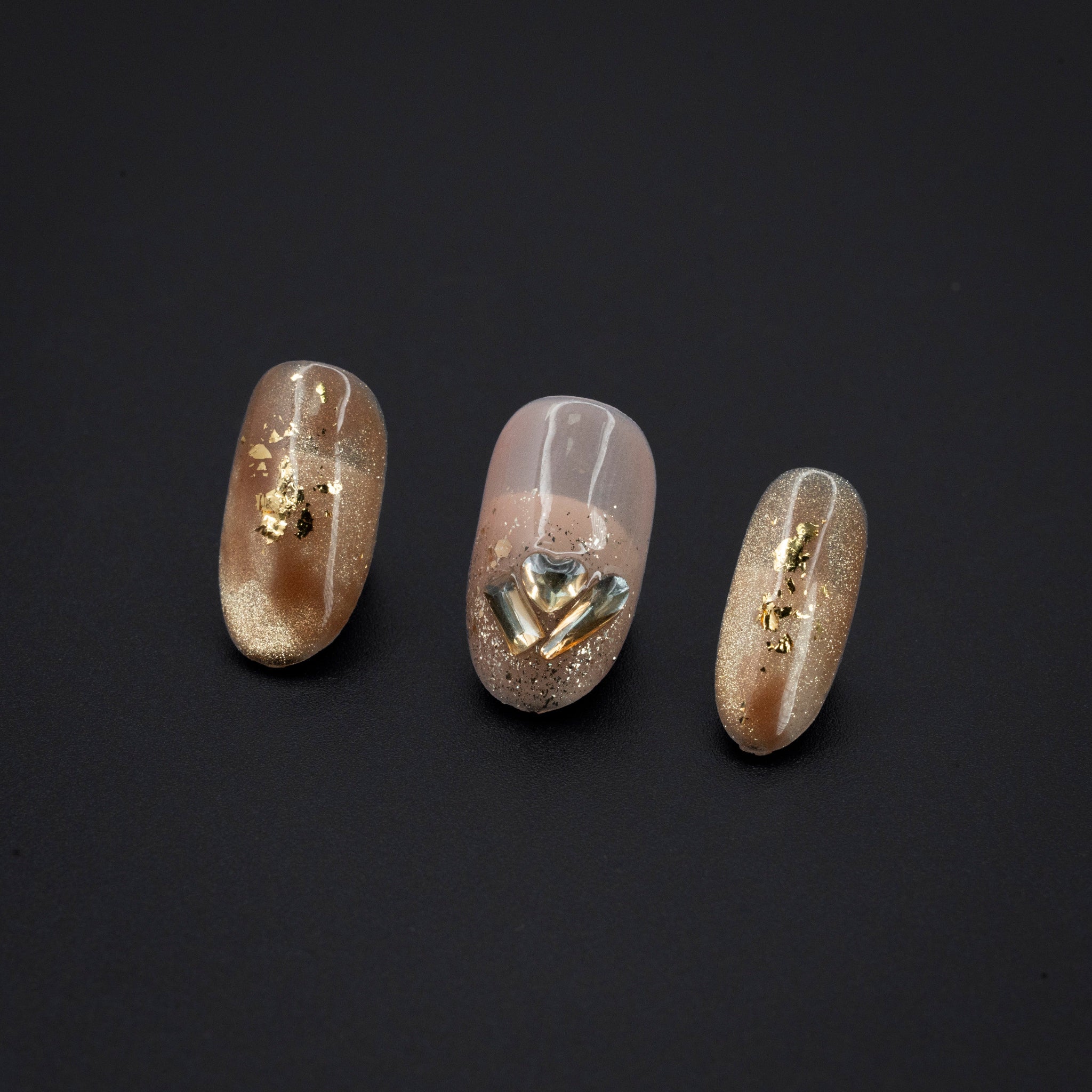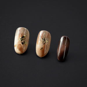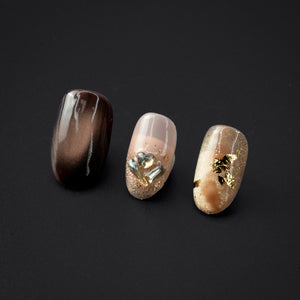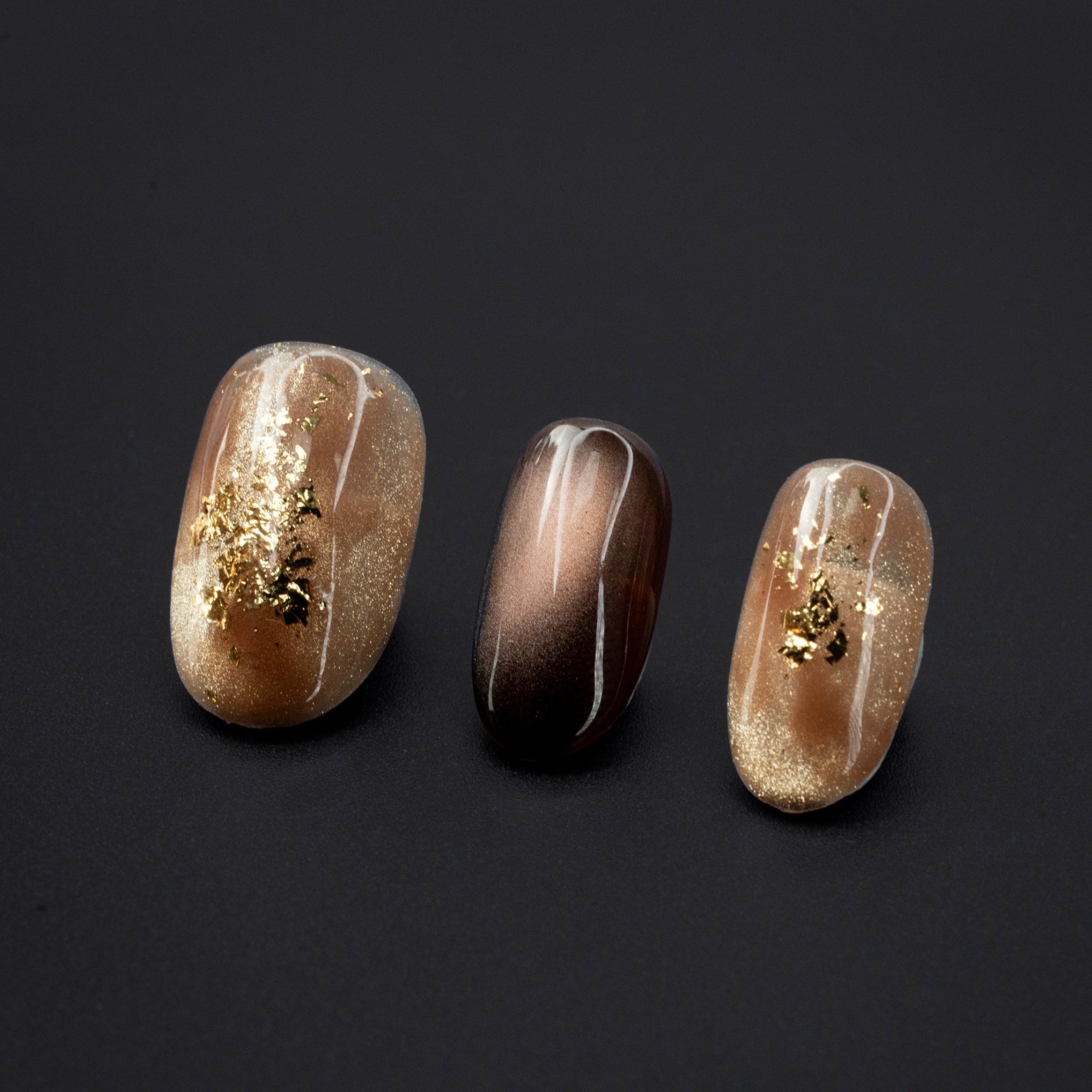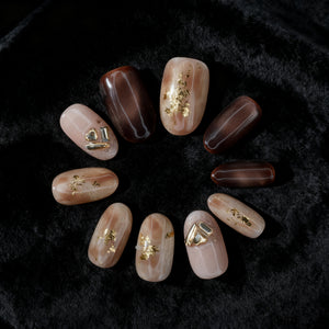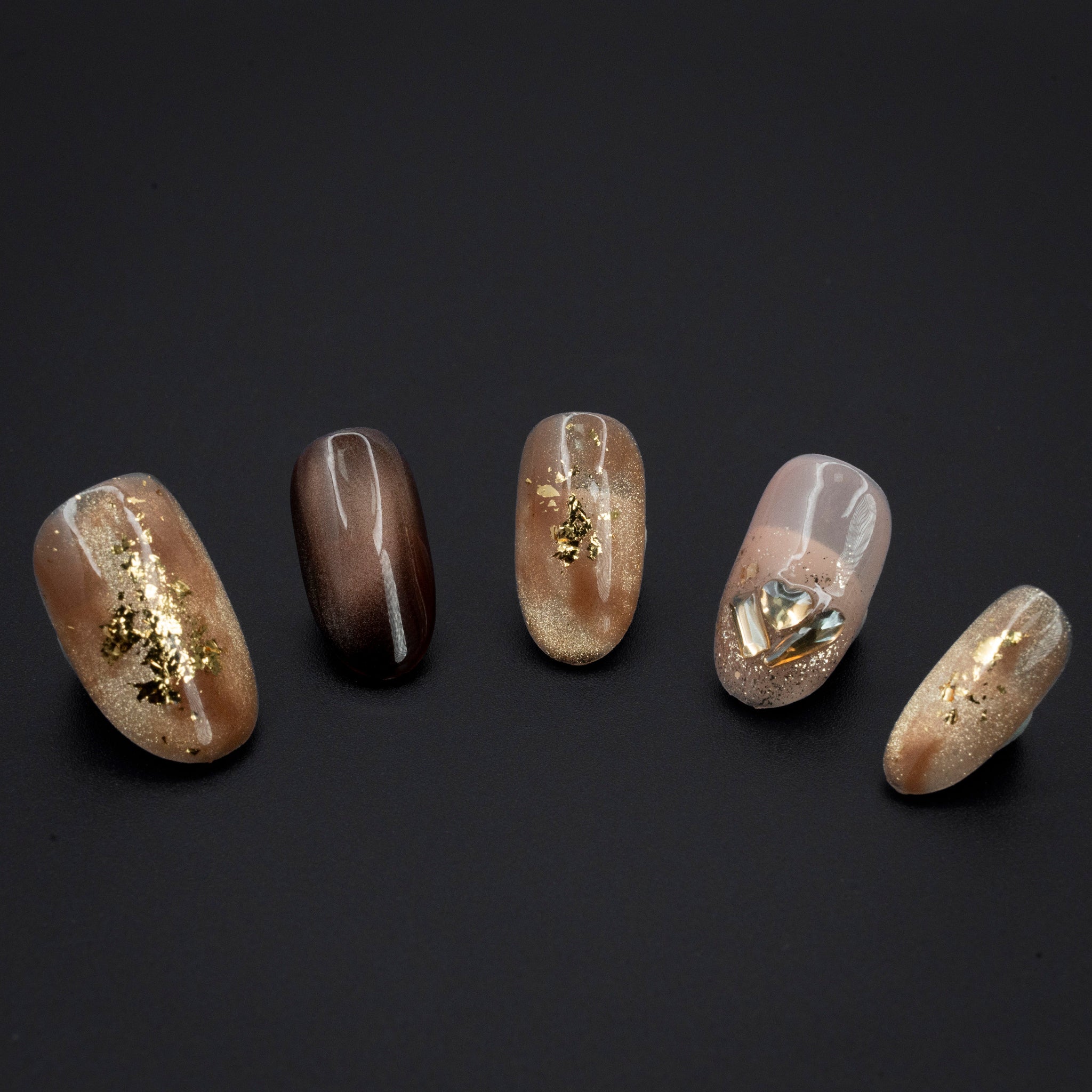 A caramel-brown gradient with delicate gold leaf accents—designed to break the monotony of standard office nails. The rich, earthy tone conveys trust and sophistication, while the subtle shimmer adds a touch of refined elegance—like wearing minimalist jewelry on your fingertips.
