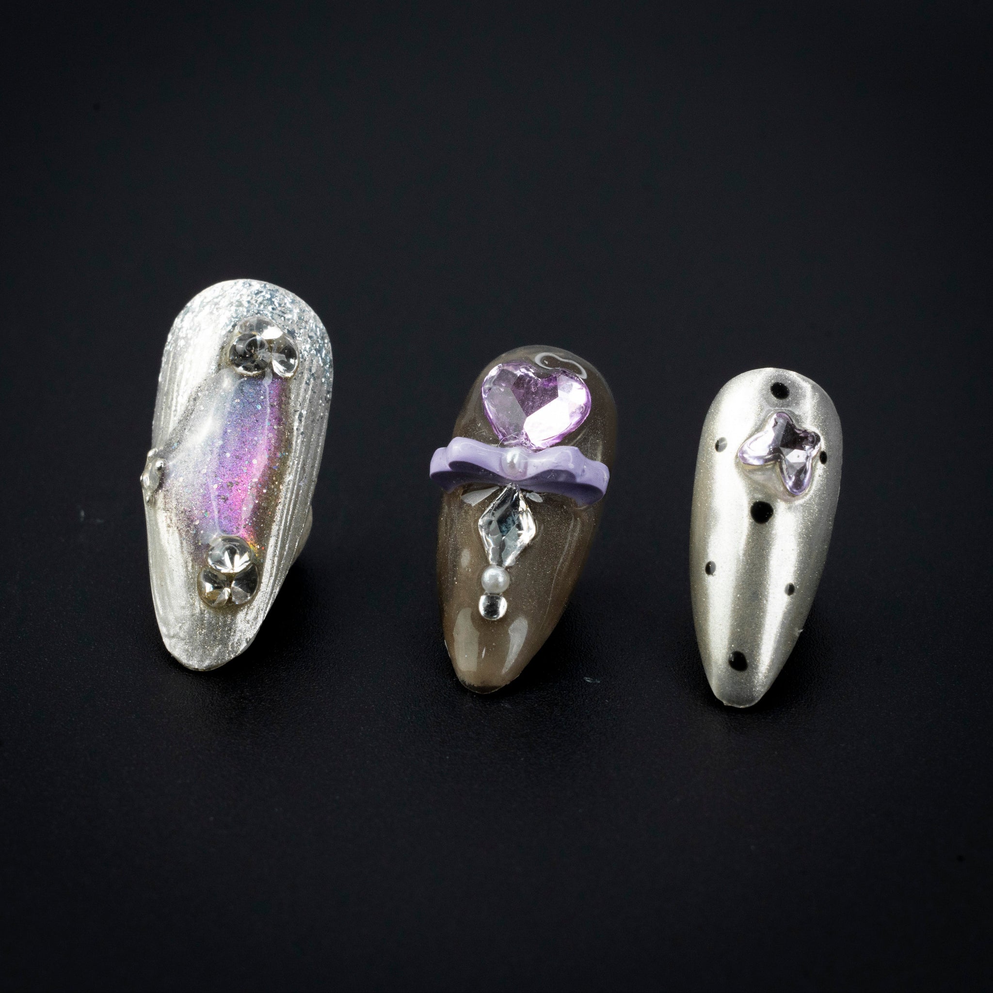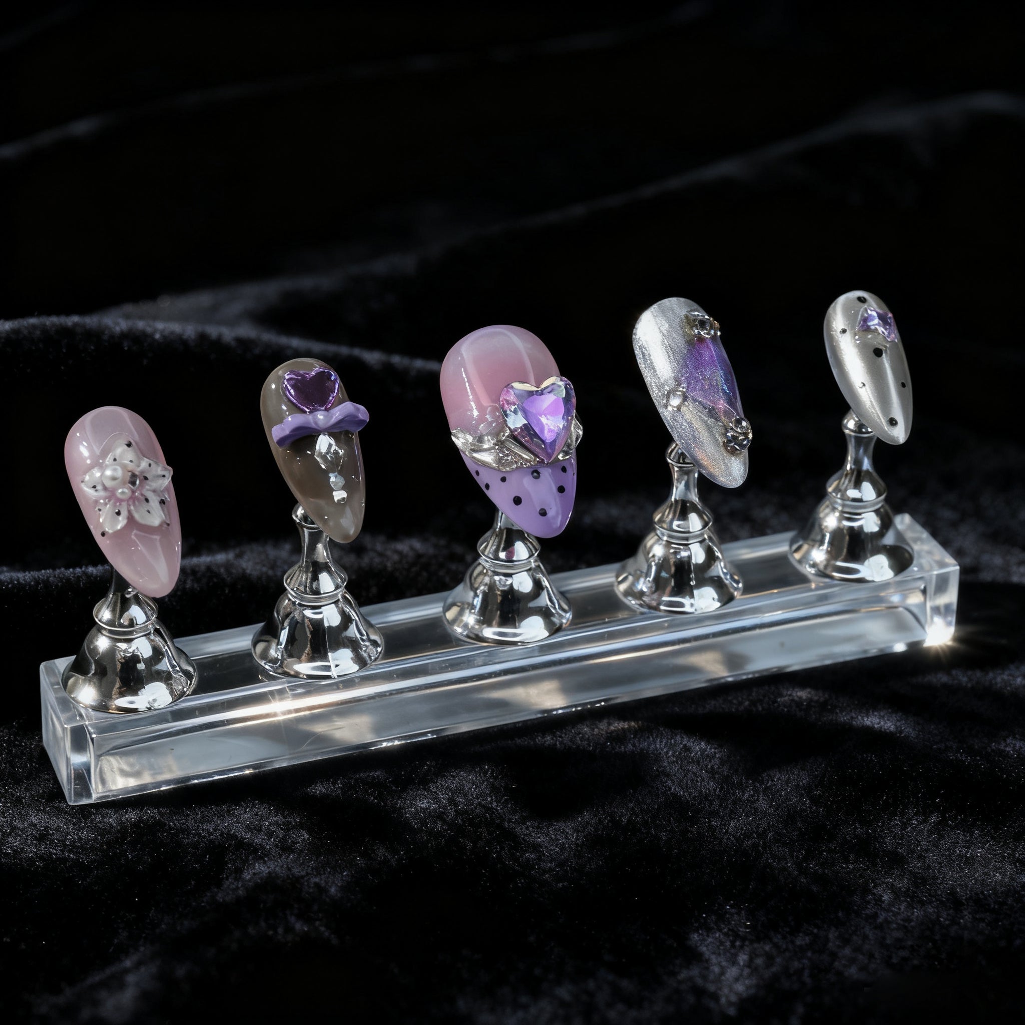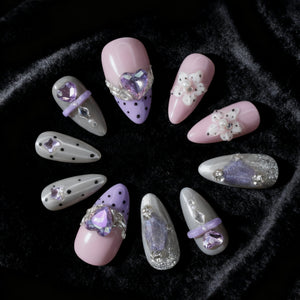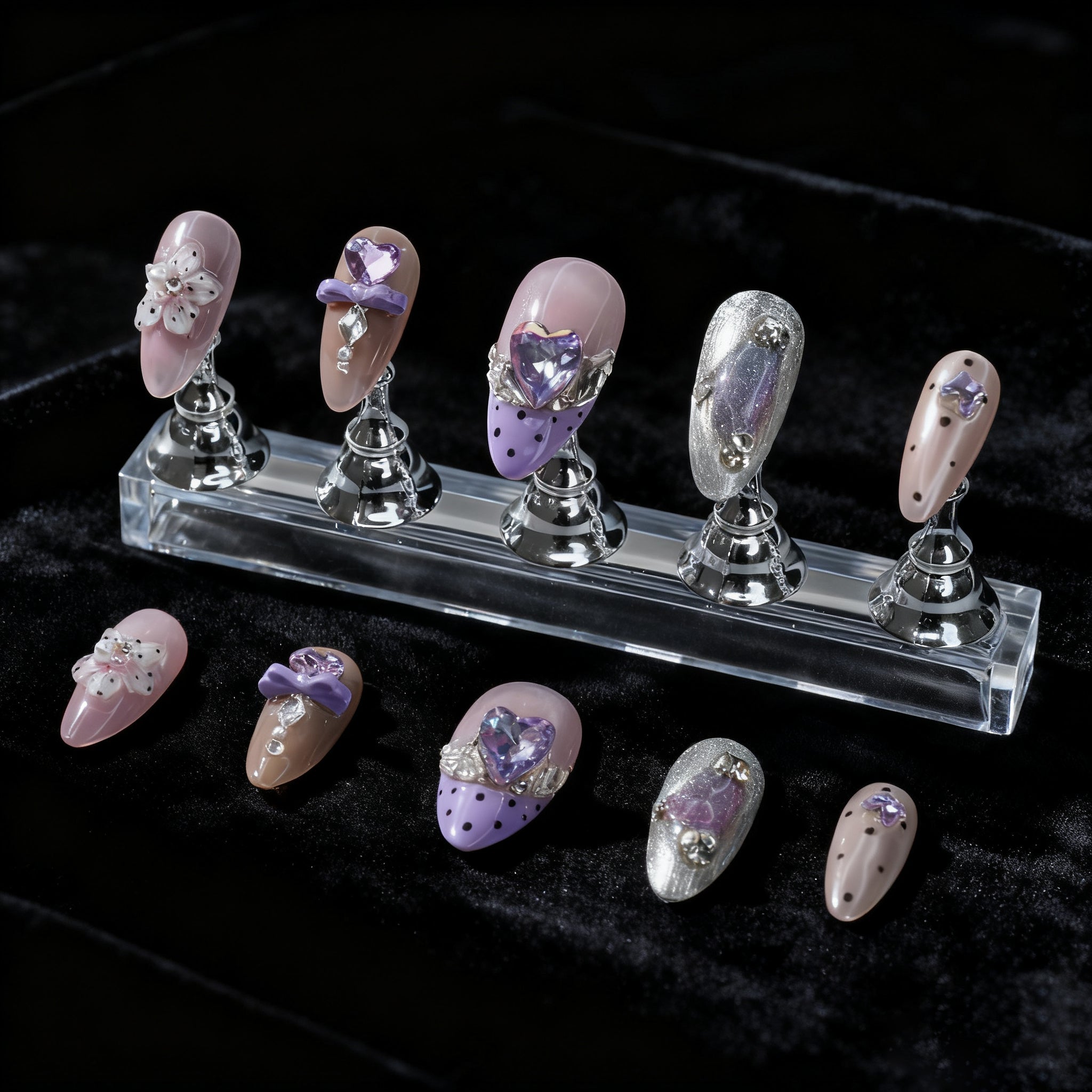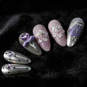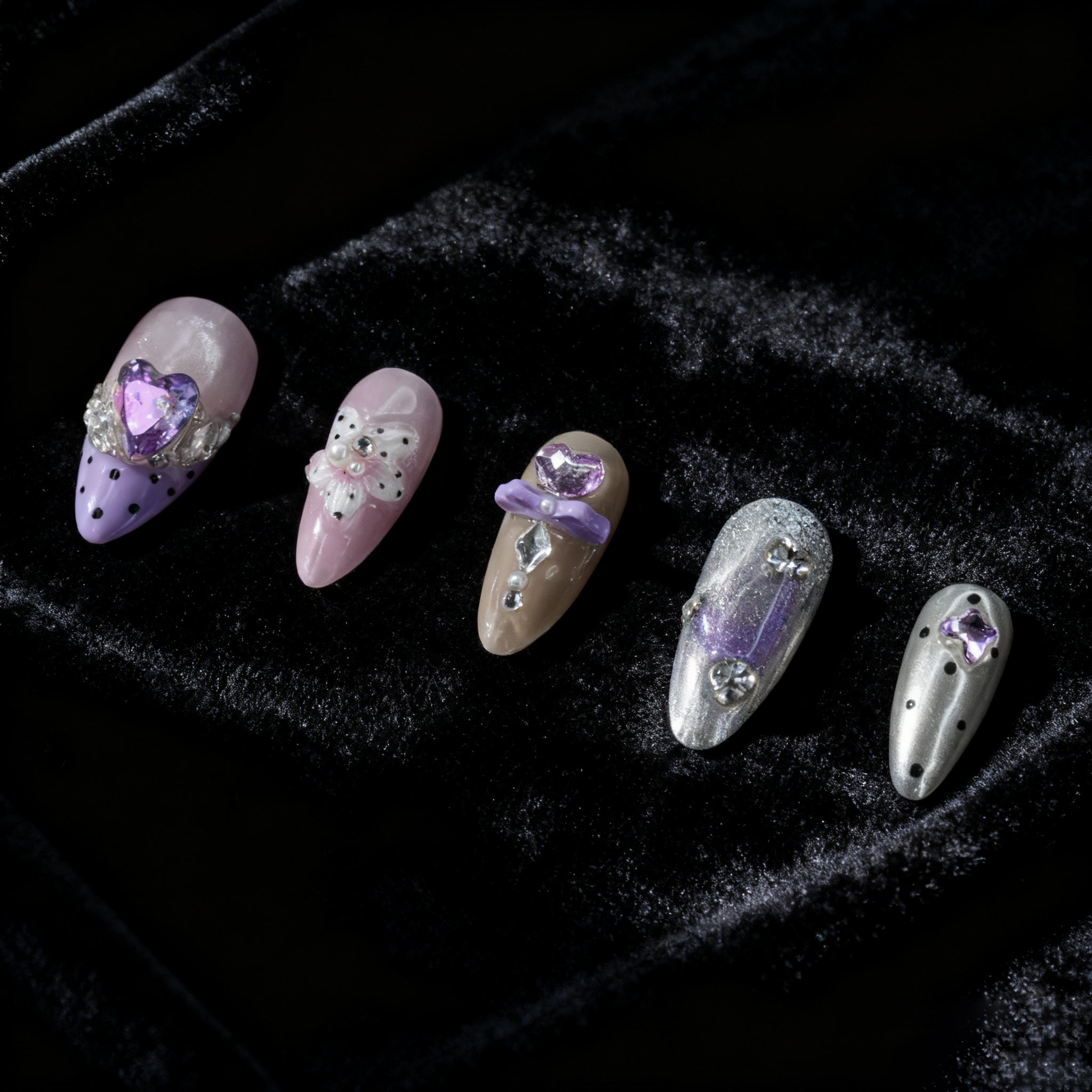· Amethyst Gems & Silver Sparkle: Delicate purple hearts meet gritty silver glitter, set off with subtle 3D floral accents—creating a striking contrast that breaks free from ordinary nail designs.