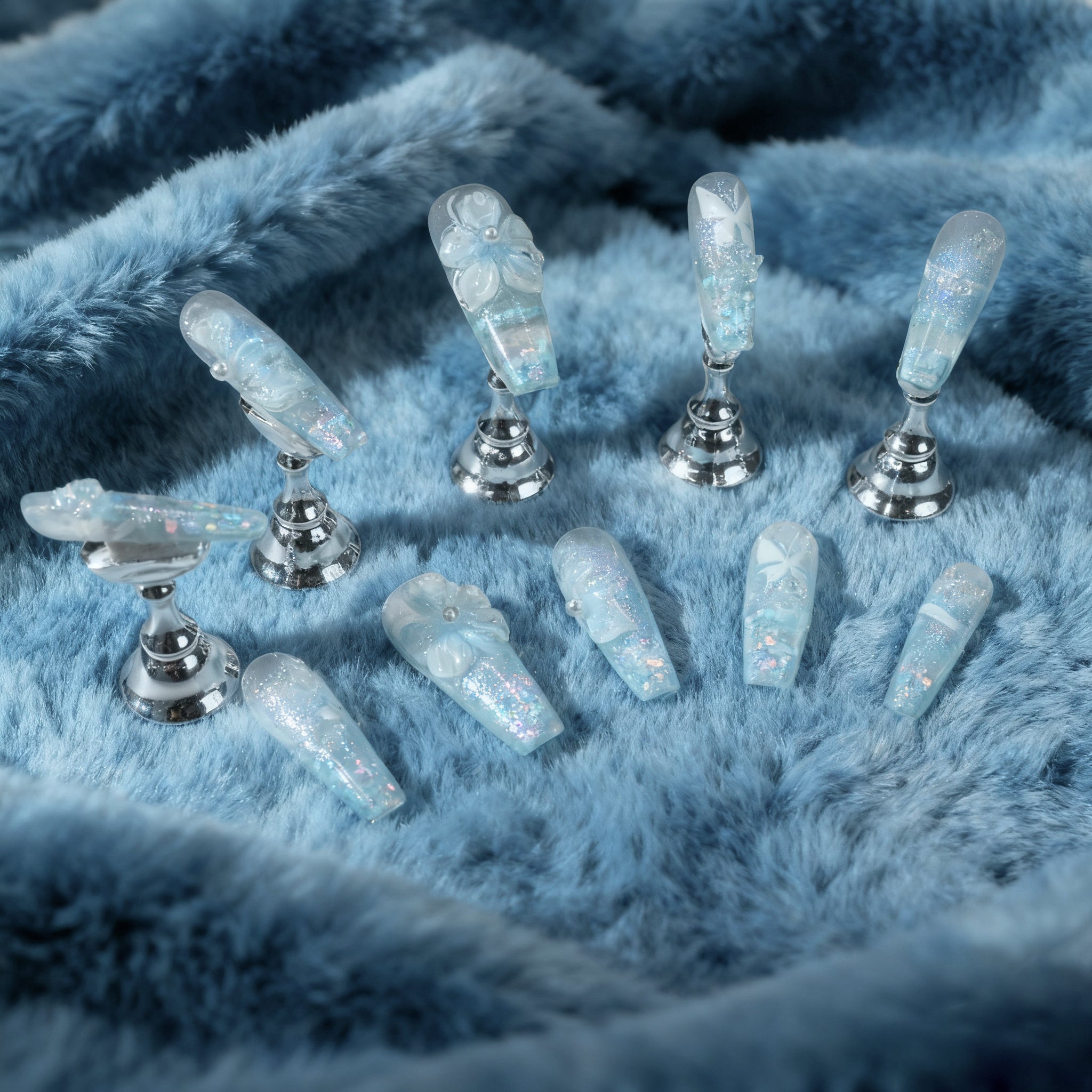 · 3D Floral & Butterfly Motifs + Soft Blue Ombre: Delicate dimensional blossoms and a subtle blue gradient create a look that is both timeless and contemporary—blending French romance with modern sophistication.