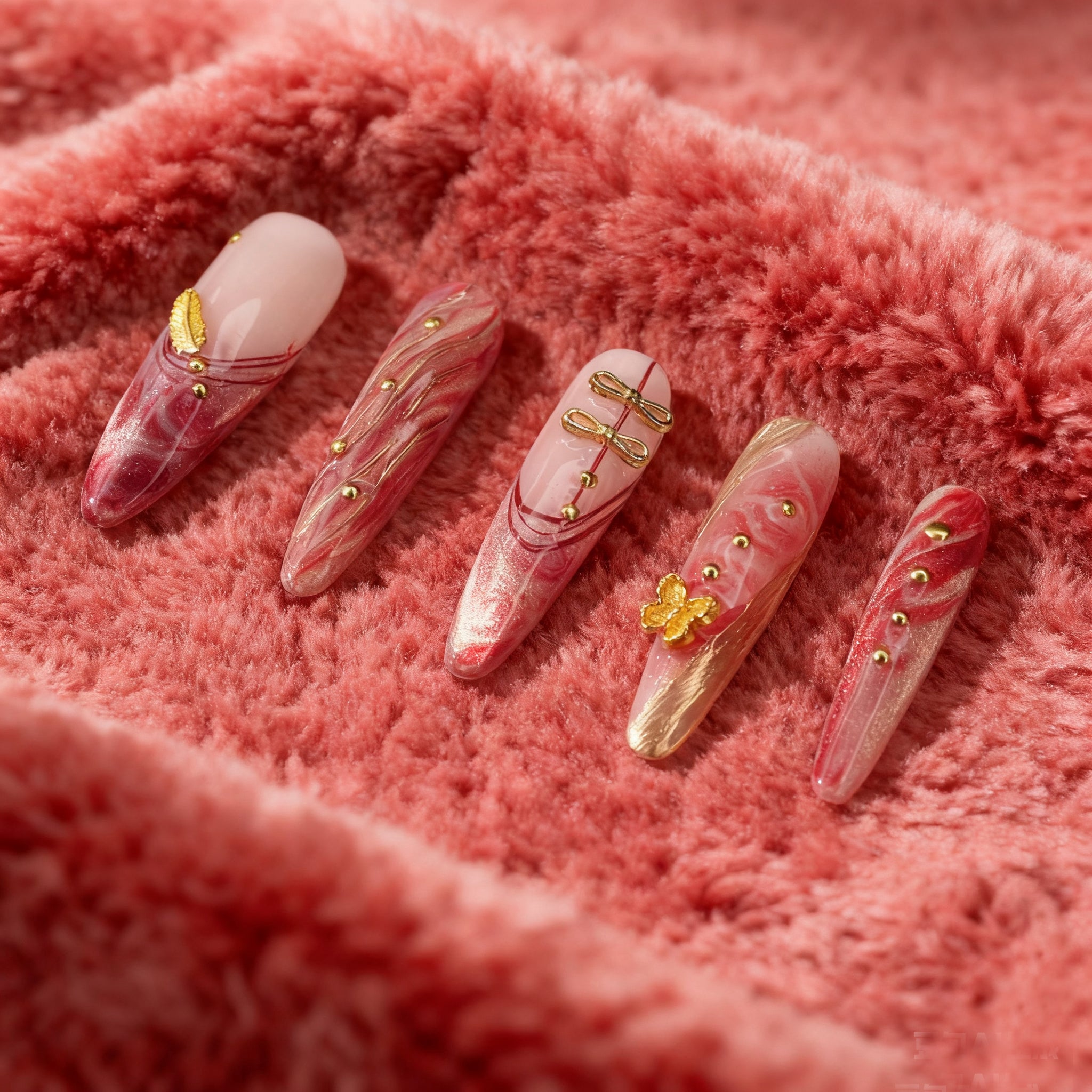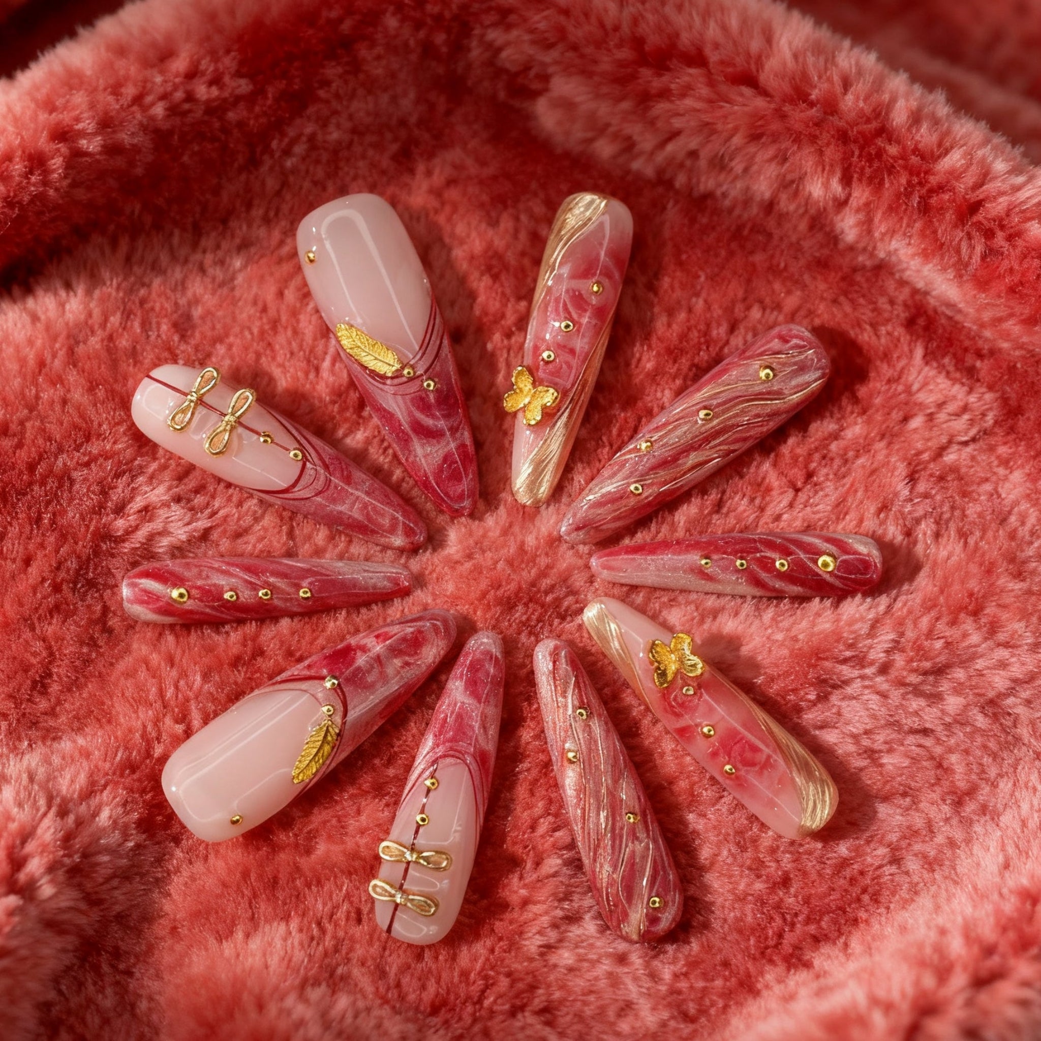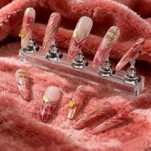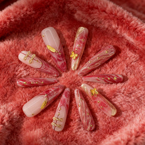 · Rich Marble Texture & Gilded Accents: A deep red base flows like natural stone, kissed with delicate gold detailing—offering dimension and sophistication far beyond solid-color nails.