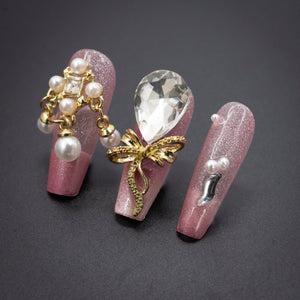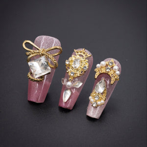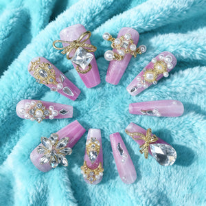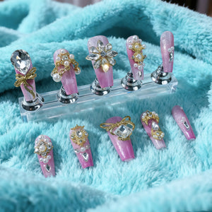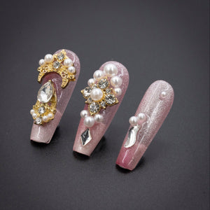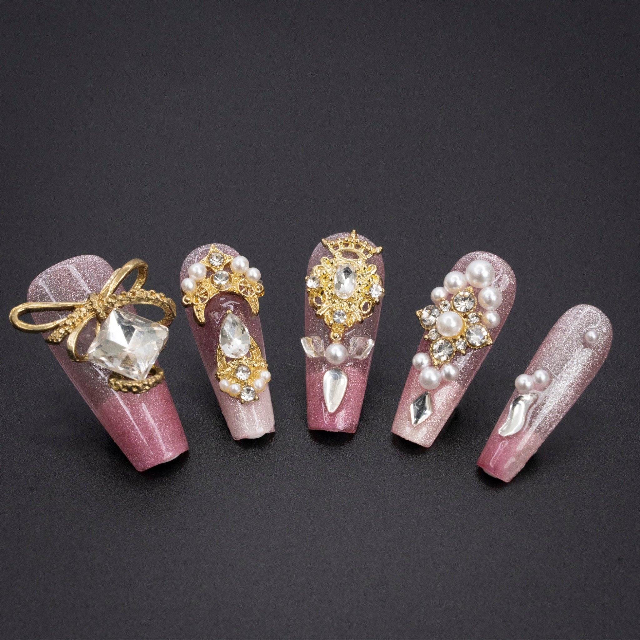 · Pink-Gold Gradient & 3D Elegance: A luminous blend of blush and gold flows beneath hand-set pearls and precision-cut crystals, creating a depth of shine no standard press-on can match.