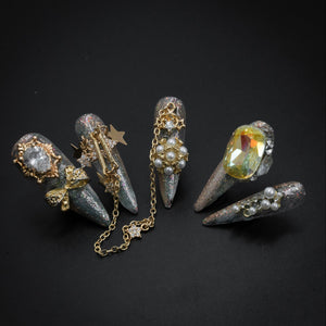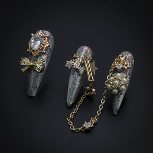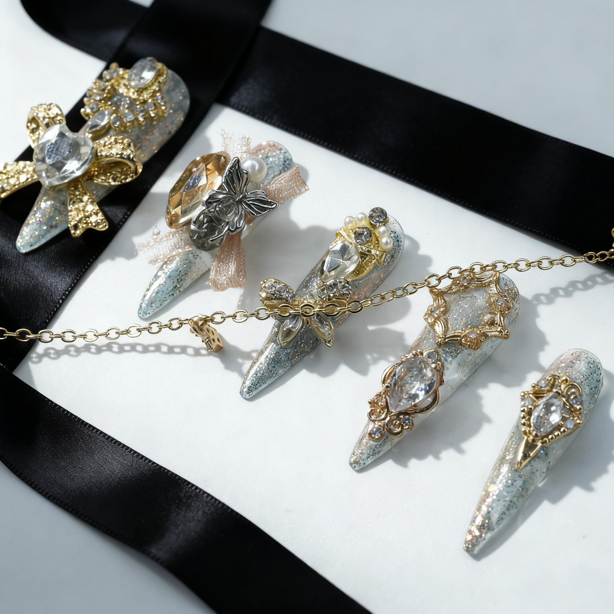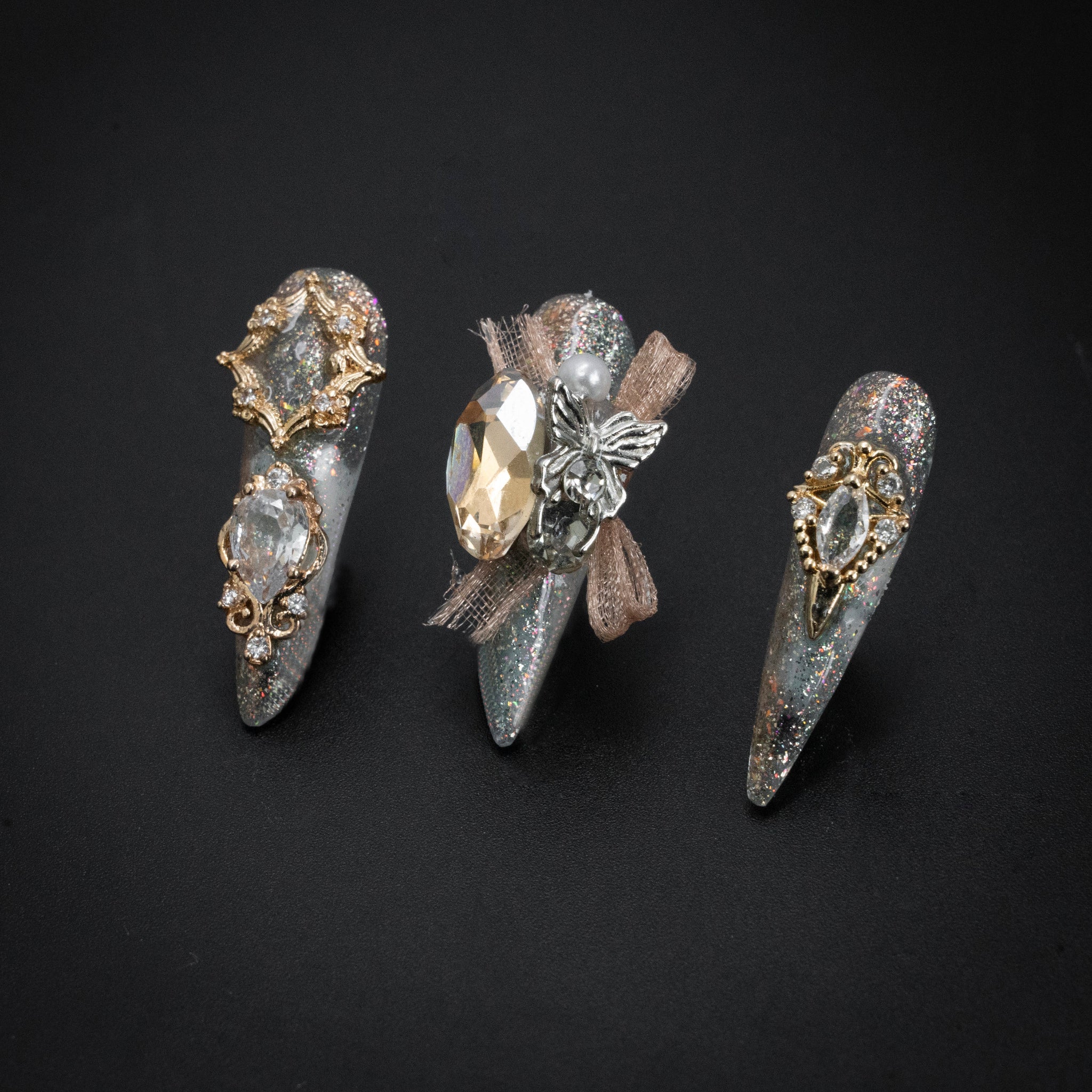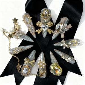 Inspired by the grand chandelier and diamond-set tableware at a ballroom gala, the designer captured that radiant, golden glamour into a press-on nail set worthy of a red-carpet moment. When a guest appeared wearing them, her fingertips shimmered like heirloom jewels under the lights—instantly drawing every lens and eye in the room.