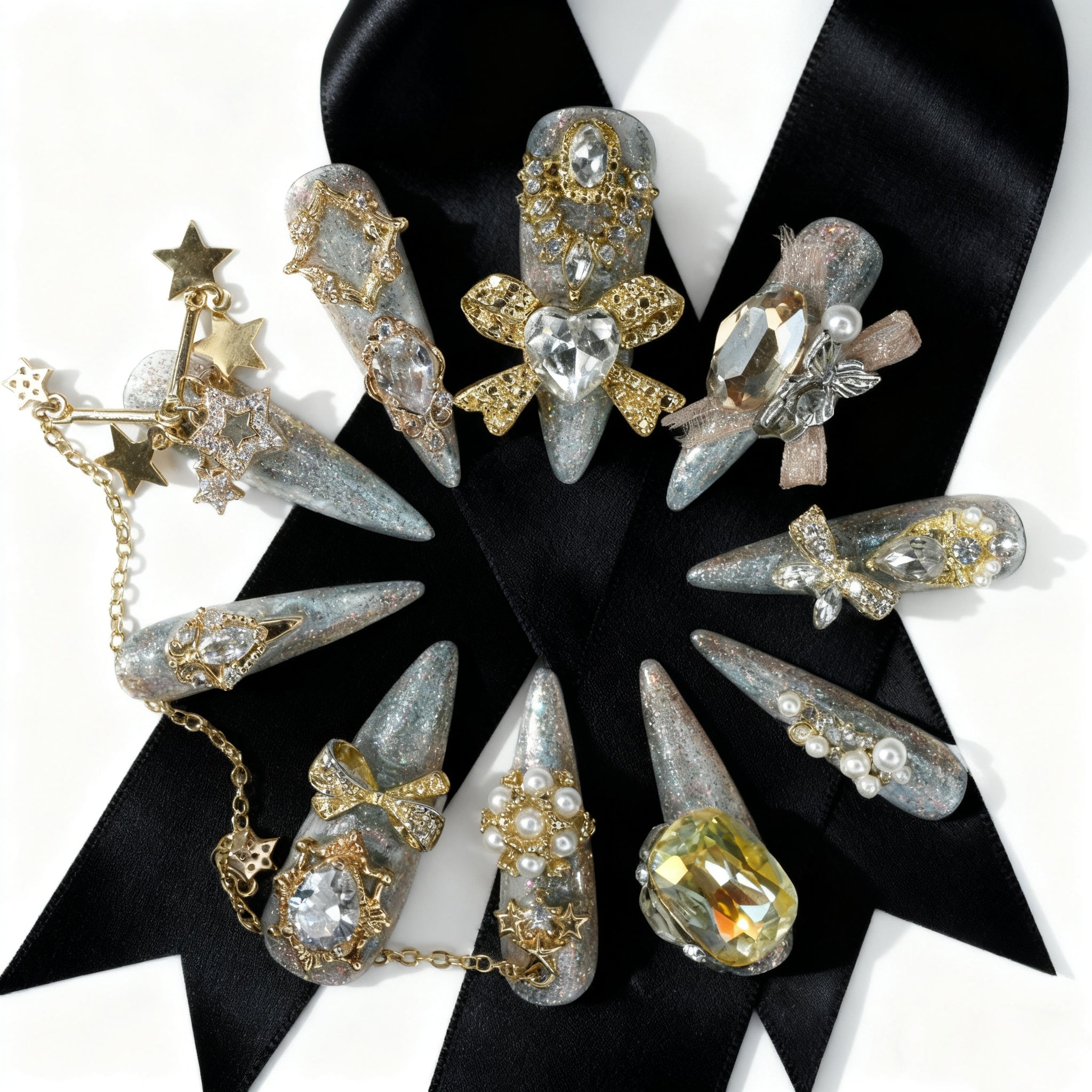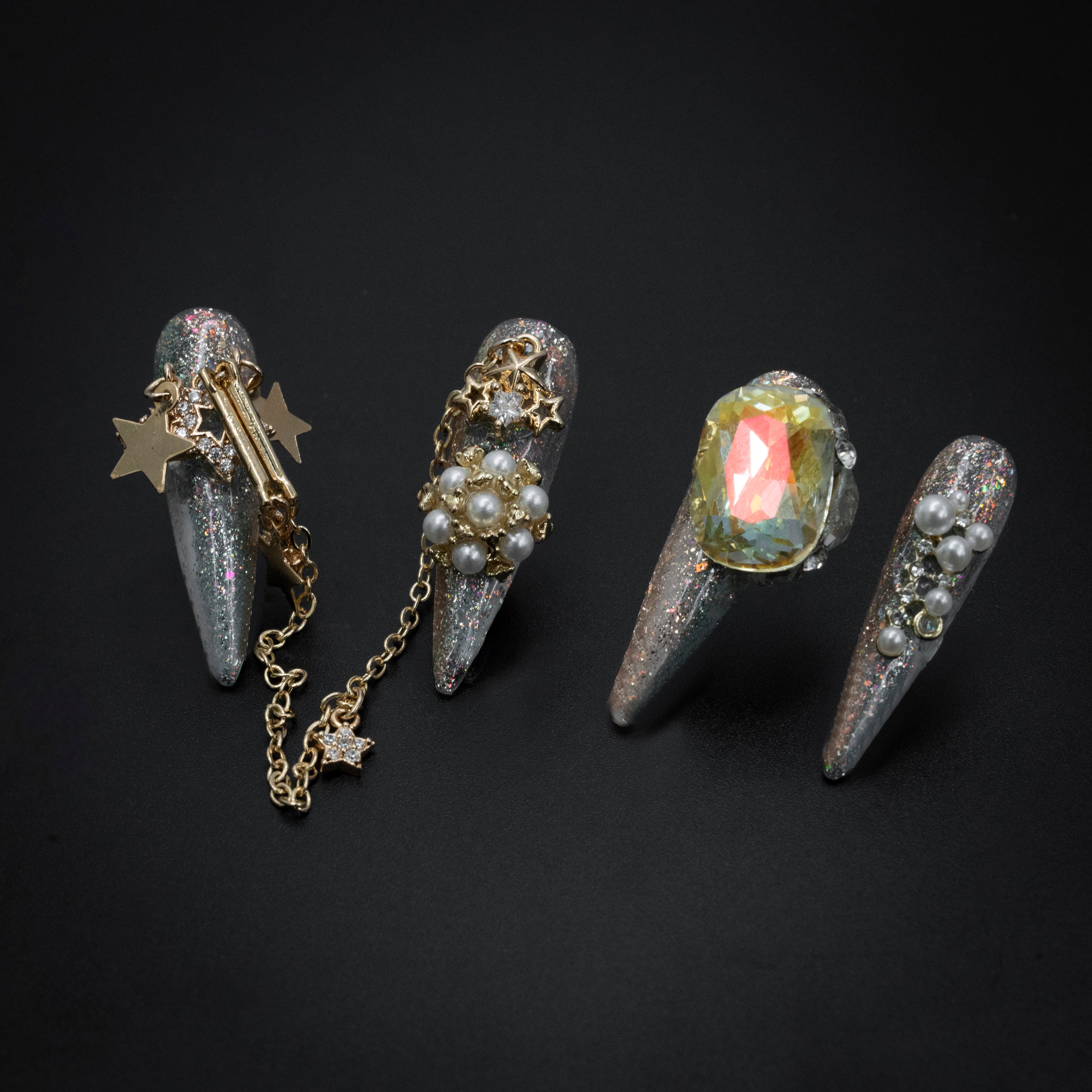 · Golden Radiance & 3D Brilliance: A brilliant gold gradient forms the base for hand-set crystals and pearls, creating a layered, luxurious effect well beyond standard press-ons.