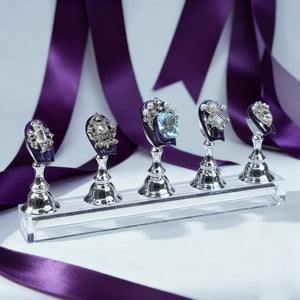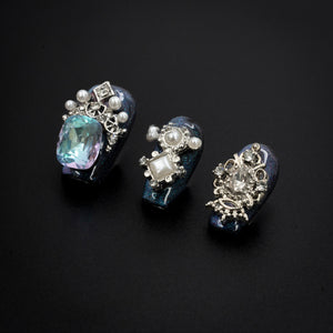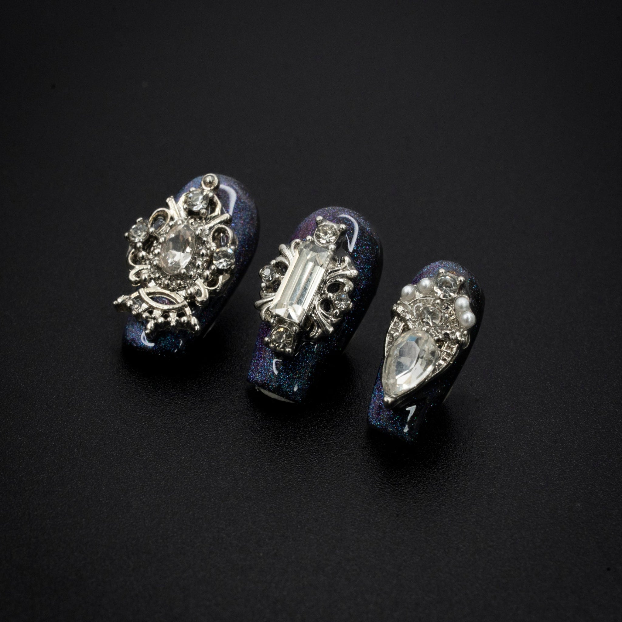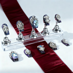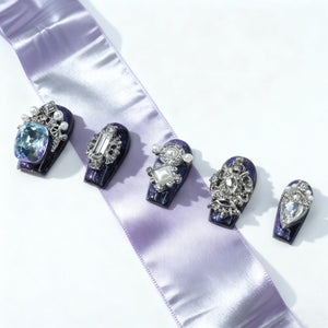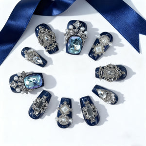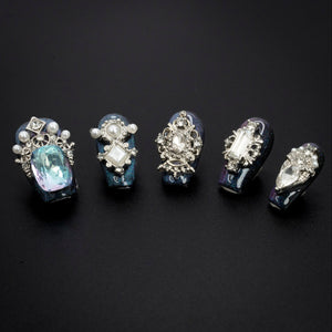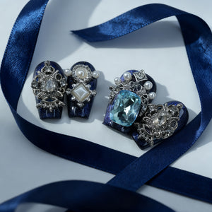 In an antique cabinet, a deep blue gemstone brooch caught the designer’s eye—its cool, mysterious glow inspiring a vision of wearable elegance. She translated that essence into these sapphire-toned press-ons, where crystal brilliance meets the soft warmth of pearls.