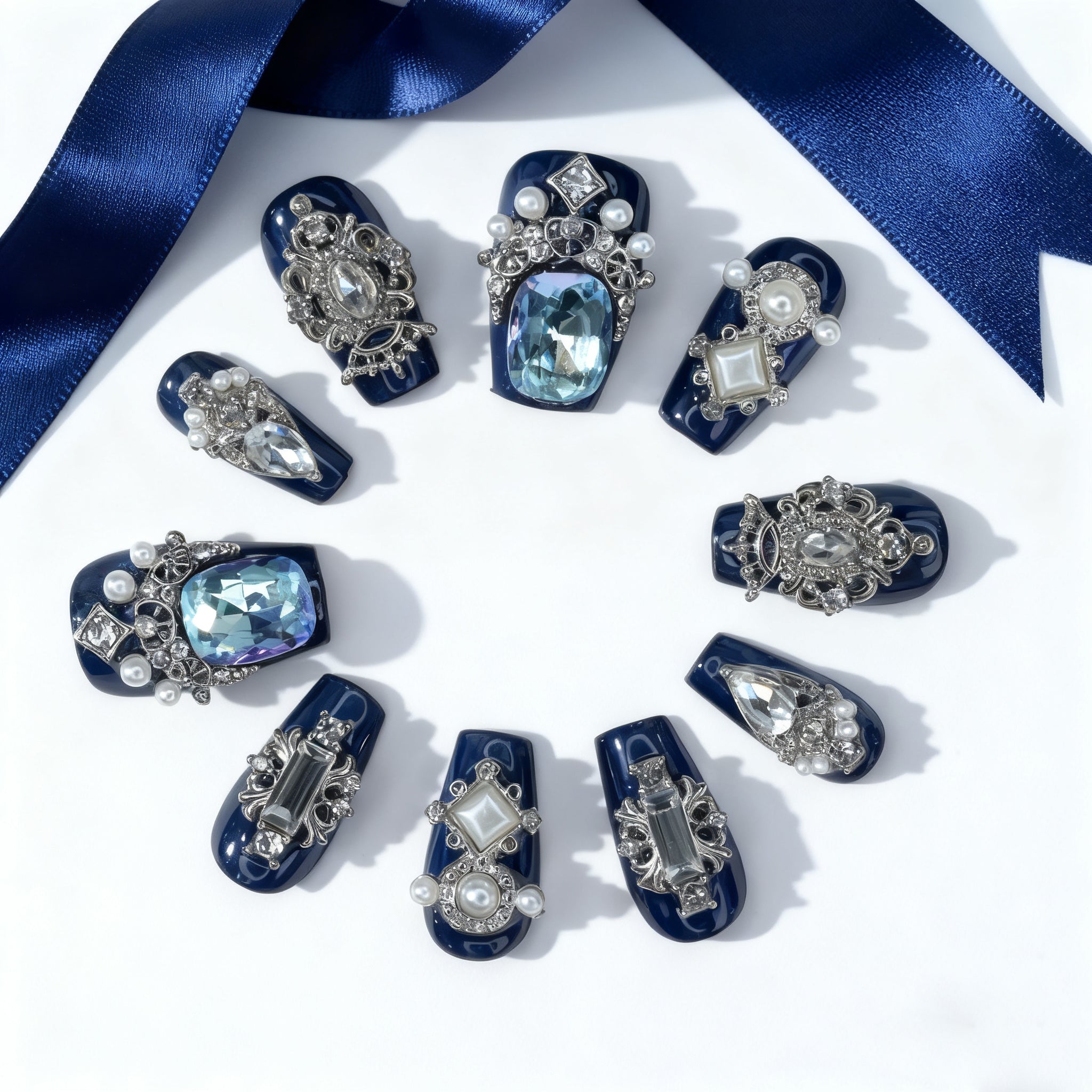 · Deep Blue Ombre & 3D Embellishments: A rich, gradient navy base is adorned with hand-set crystals and cultured pearls, creating a layered, luxurious effect far beyond ordinary press-ons.