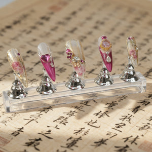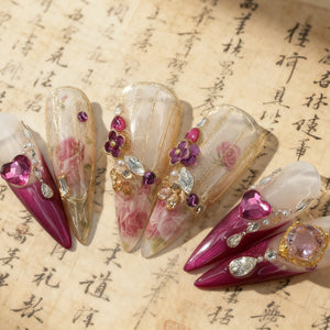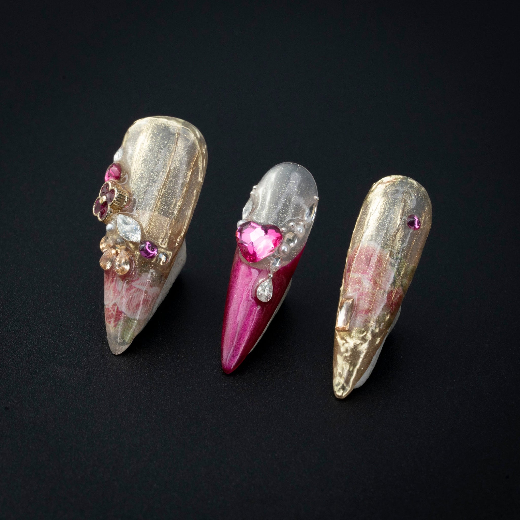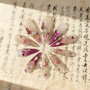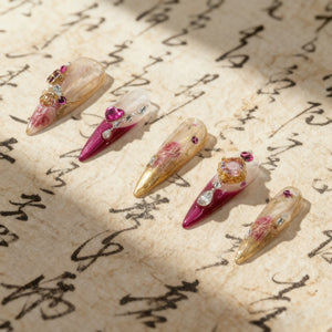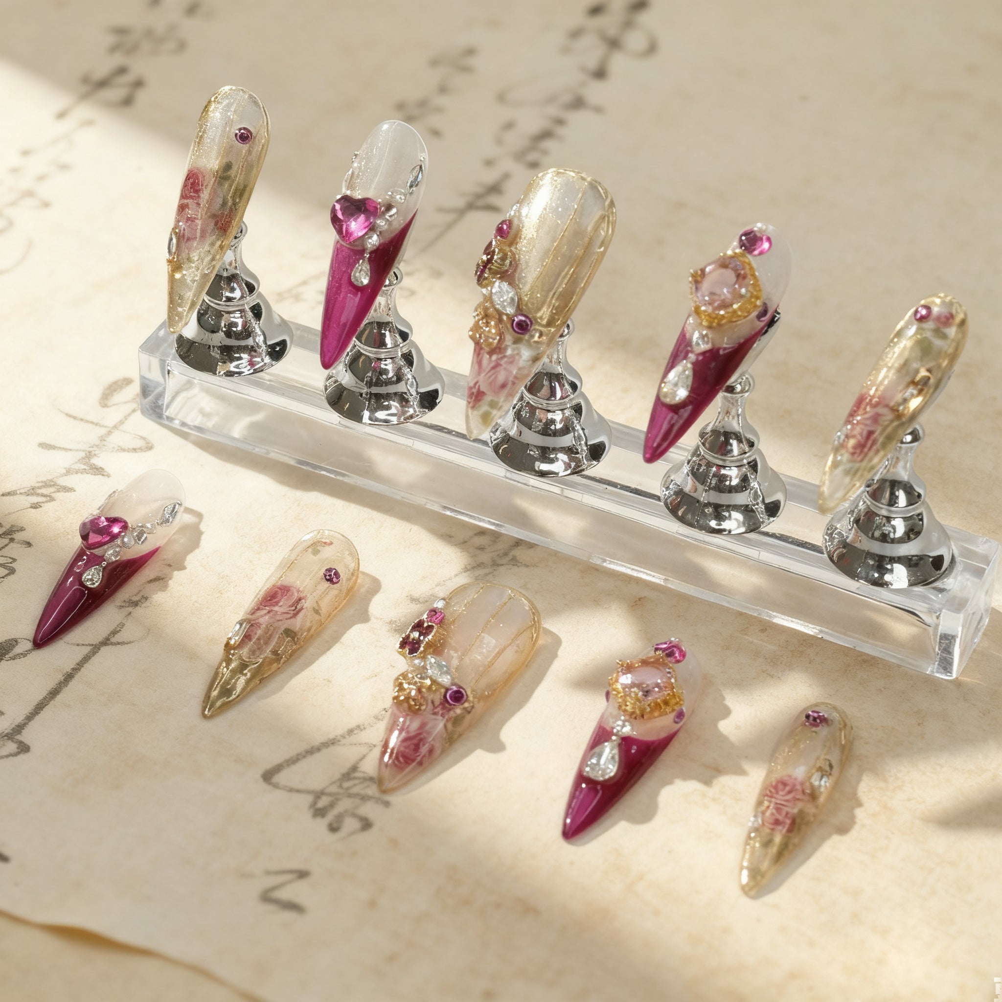 Now, that same defining elegance is yours to command. With a single click, possess this wearable art. Our press-on nails are crafted with hyper-realistic 3D crystals and intricate floral designs, emulating the meticulous work of an haute couture nail artist. Designed in a striking stiletto shape and a soft pink-and-gold palette, they blend timeless elegance with modern luxury.