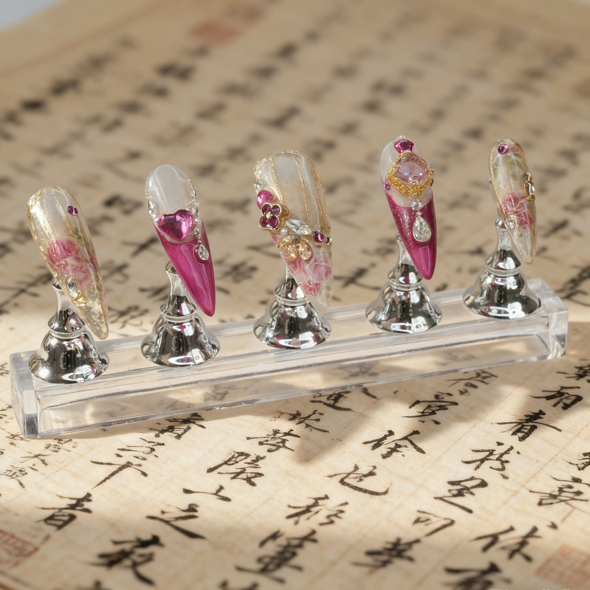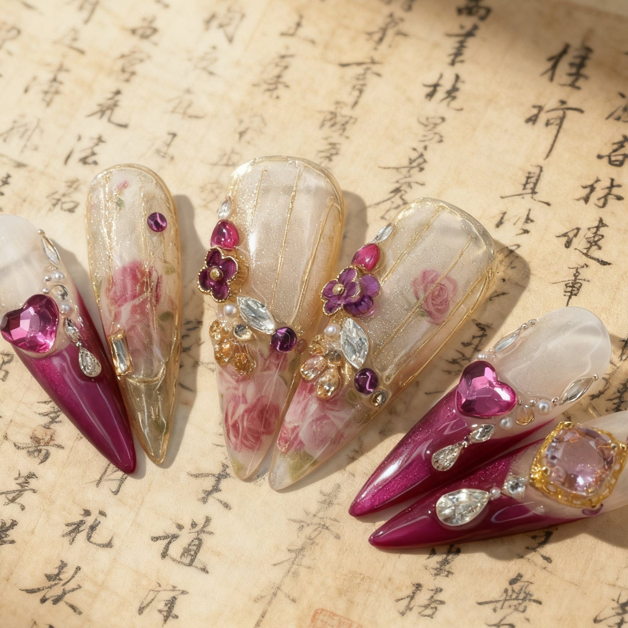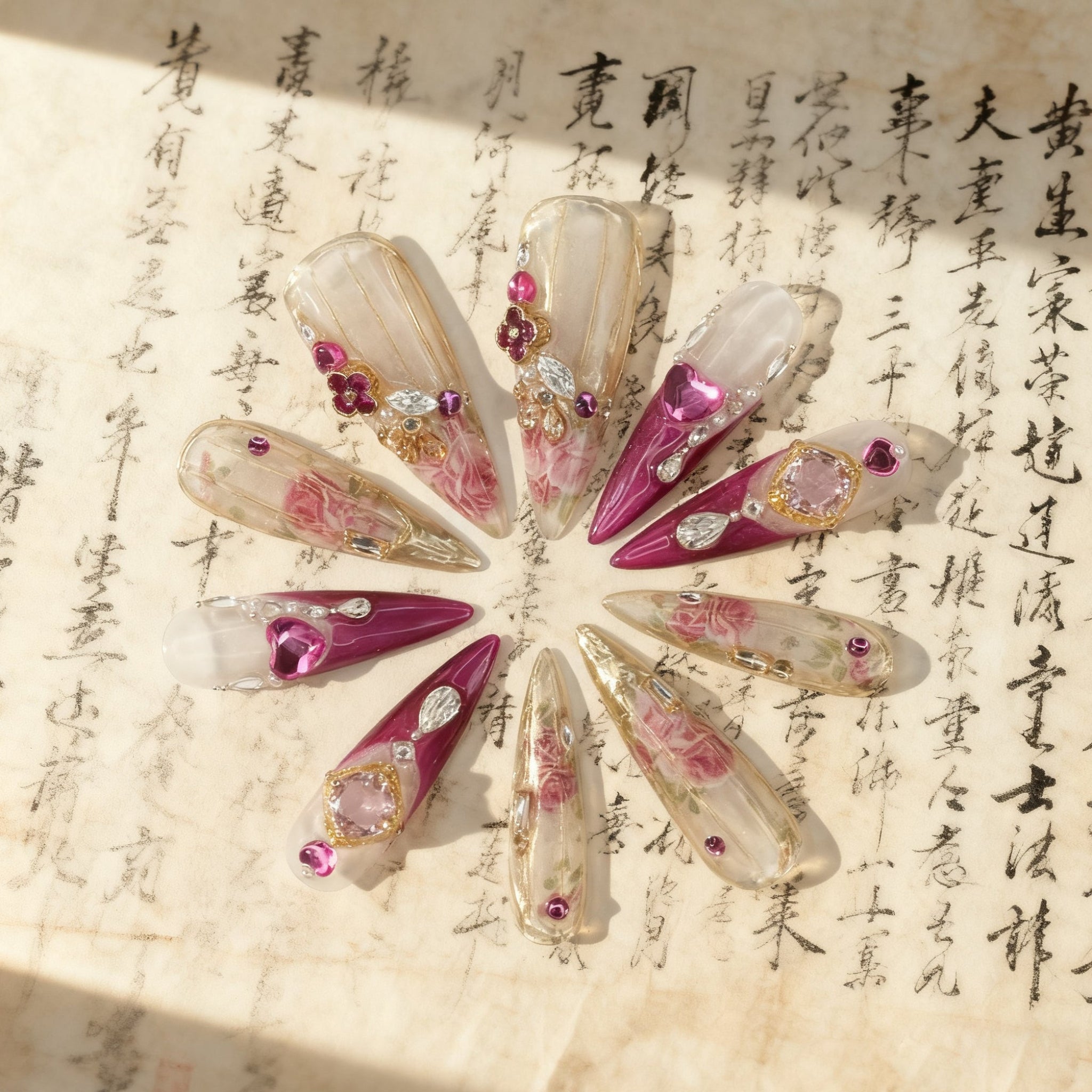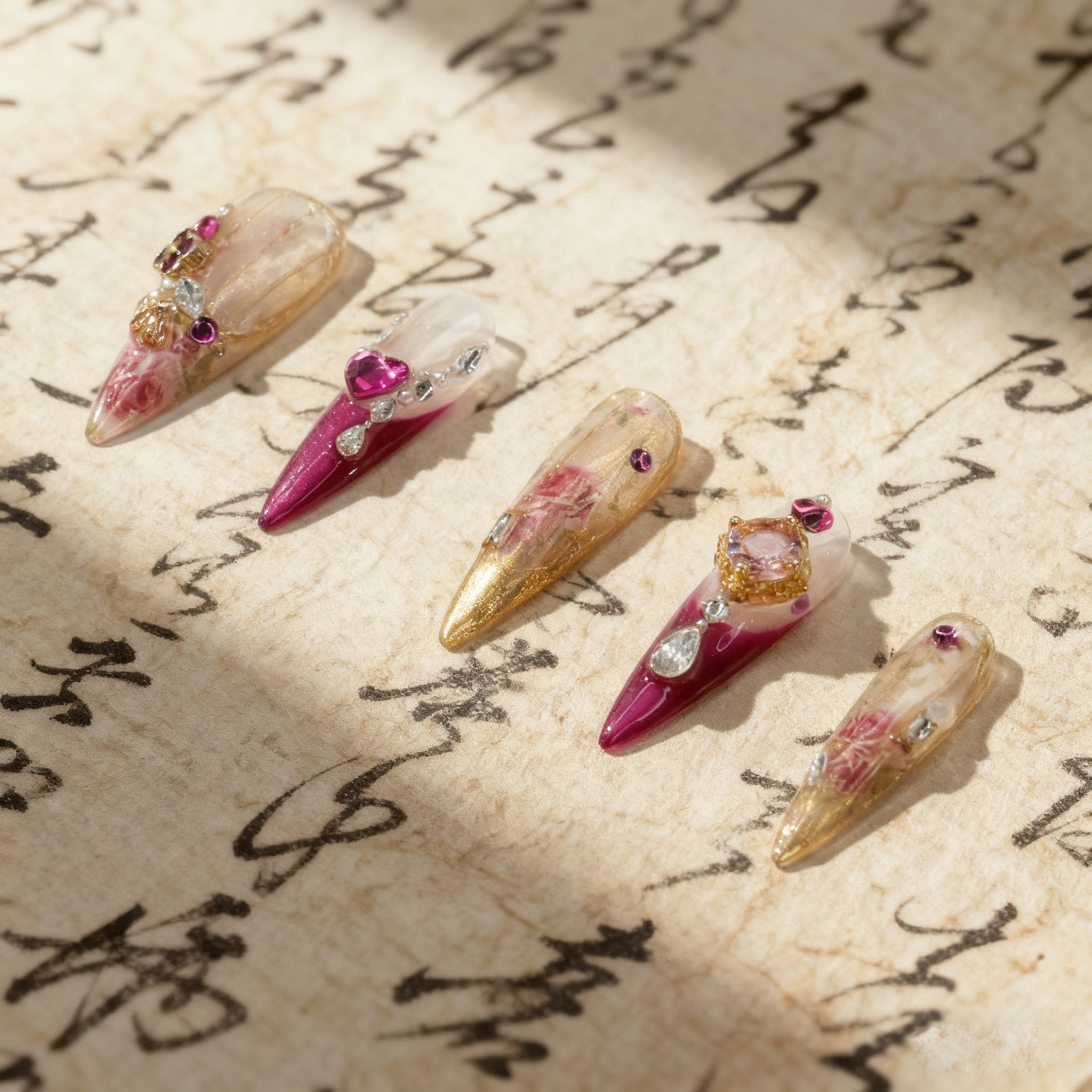 The inspiration arrived in the delicate form of rose petals and the sparkle of fine jewels—masterfully reimagined for the fingertips. From the moment she appeared, all eyes were captivated by her hands.